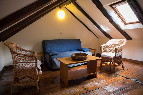 Sala de estar abuhardillada donde relajarse escuchando música o entretenerse con nuestros juegos de mesa además de un amplio jardín cerrado con mobiliario y barbacoa para disfrutar al aire libre.